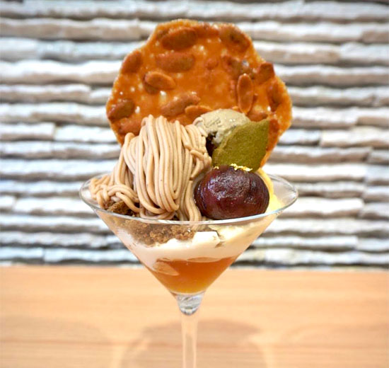 お芋クリーム、棒ほうじ茶アガー、胡桃とほうじ茶のクランブル、渋皮マロンアイス、和栗のモンブランクリーム、煎茶米粉クッキー、栗の渋皮煮、アーモンドキャラメルチュイール、さつま芋アイス、棒ほうじ茶ジェラート