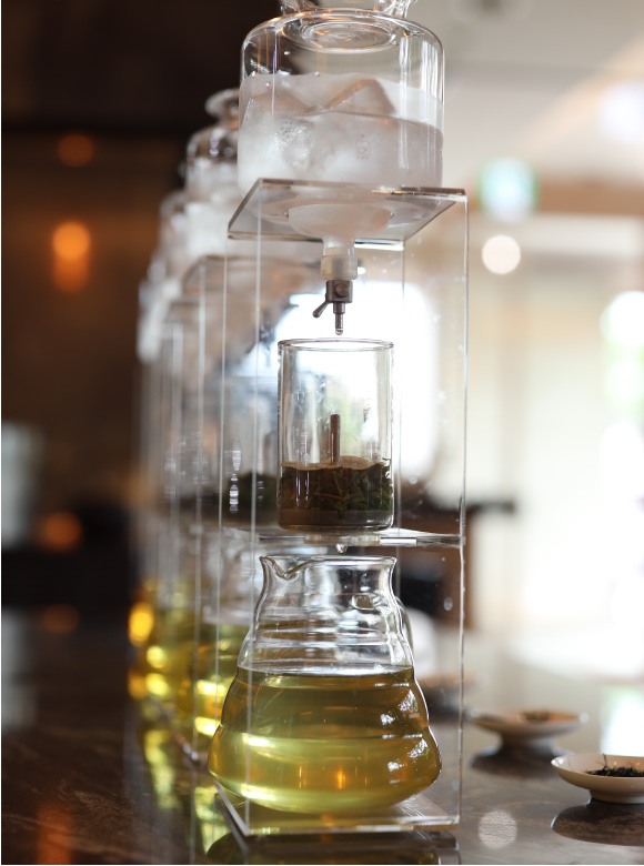 百灯瀬では専用のドリッパーを使い、漬け込みとは一味違う、雑味の少ない味をお楽しみいただけます。3時間かけて一滴一滴茶葉に冷水を落とし、茶葉を開かせ、旨みと甘みを引き出す製法です。