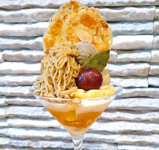 和栗モンブラン、渋皮マロンクリーム、渋皮マロンアイス、さつまいもアイス、棒ほうじ茶ジェラート、クランブル、棒ほうじ茶ゼリー、栗の渋皮煮、アーモンドチュイール、芋クリーム、パンナコッタ、煎茶米粉クッキー