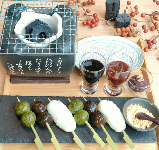 自家製の煎茶団子、ほうじ茶団子、特製五平餅を炭火で、お好みの焼き加減・お好みのトッピングでお召し上がりください。